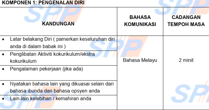 Untuk komponen 1, calon perlu memperkenalkan diri. Kandungan yang perlu ada di dalam komponen ini, telah dinyatakan oleh pihak SPP, calon hanya perlu ikut kepada kandungan tersebut. Masa yang diberi agak pendek iaitu 2 minit sahaja, jadi calon perlu mengolah ayat dengan sebaik mungkin. Ringkas tapi memenuhi kehendak!