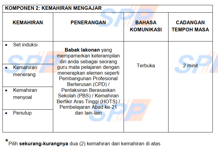 Komponen 2 pula adalah kemahiran mengajar. Pada bahagian ini, calon perlu memilih sekurang-kurangnya dua kemahiran mengajar. Sebagai contoh, saya telah memilih dua komponen iaitu set induksi dan juga penutup. Tips, pilihlah kemahiran mengajar yang anda mahir supaya dapat diaplikasikan dalam masa yang diberikan. Mengajar itu memang mudah, tapi yang sukarnya disini apabila masa yang diberikan sangatlah singkat. Jadi buatlah yang terbaik !