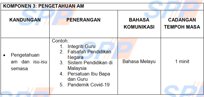 Komponen yang terakhir sekali adalah pengetahuan am. Tujuan komponen ini adalah untuk menguji sejauh mana pengetahuan am ataupun kecaknaan calon terhadap isu terkini. Calon bebas untuk memilih apa sahaja tajuk yang ingin dikupas, asalkan berkait dengan pendidikan. Bagi komponen ini, saya telah mengupas tajuk Pendidikan di Era Pandemik Covid-19. Pada waktu itu, Pandemik Covid-19 merupakan satu isu yang sangat panas, dan saya telah mengaitkan isu tersebut dengan pendidikan di Malaysia. Pastikan tajuk yang kita kupas ringkas tapi padat, memadai dengan masa yang diberikan iaitu 1 minit.