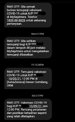 Setelah berjaya mendaftar, apa yang perlu dibuat adalah menunggu butiran temujanji yang akan diberikan dalam tempoh 48 jam (2 hari). Butiran temujanji akan diberikan melalui aplikasi MySejahtera dan juga SMS. Pada bahagian ini, maklumat yang tepat perlu diisi supaya butiran ini sampai kepada kita. Kalau salah, kita yang merana, tunggu pada yang tak pasti (dah isi salah, mestilah tak sampai maklumat, hahaha). Selepas menerima butiran, kita perlu mengesahkan butiran dan mengesahkan temujanji di dalam aplikasi MySejahtera. Kalau tak disahkan dalam masa 48 jam, temujanji akan dibatalkan. Jadi sila cakna pada bahagian ini!
