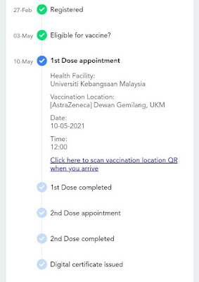 Setiap orang berbeza, ada yang selepas suntikan sudah rasa perbezaan, ada yang tidak. Bagi saya, selepas suntikan, badan saya mulai panas dan berpeluh. Tetapi ianya sekejap sahaja, lebih kurang 5-10 minit. Selepas itu, kembali normal. Mungkin juga perkara ini berlaku sebab saya terlalu memikirkan tentang suntikan. Jadi tips dekat sini, lepas kena suntik, kita biarkan ia berlalu, jangan terlalu banyak berfikir, nanti boleh memberi kesan kepada kita. Kemudian setelah selesai suntikan, saya bergerak ke kaunter seterusnya (lupa pula nama kaunter). Di kaunter ini, saya diminta untuk mengesahkan pemberian vaksin, nanti akan keluar status yang kita telah menerima dos pertama di dalam Mysejahtera. Saya juga telah diberikan kad temujanji bagi dos kedua. Bagi vaksin AstraZeneca, jarak antara dos pertama dan kedua adalah selama 12 minggu (3 bulan) bagi memastikan vaksin dapat berfungsi dengan optimum.