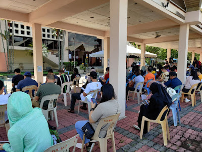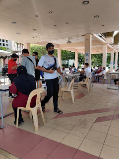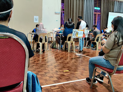 Pada jam 11.40 pagi, saya bersama dengan rakan-rakan telah tiba di Dewan Gemilang, UKM, Bangi. Sebaik sahaja sampai, kami terus bergerak ke Dewan Gemilang untuk pendaftaran. Di sini setiap penerima vaksin perlu mengisi dua helai borang persetujuan suntikan vaksin Covid-19 yang telah disediakan. Anda tak perlu bawa borang sendiri, sebab apa? Sebab di UKM, Bangi memang borang telah disediakan, pen juga disediakan. Hanya bawa diri sendiri sahaja. Saya bagitahu perkara ini sebab saya ada terbaca 1 post di Twitter yang menyatakan penerima vaksin digalakkan untuk print borang sendiri dan juga membawa pen bagi memudahkan perjalanan vaksinasi. Tapi ia berbeza bagi saya, mungkin hal ini hanya teraplikasi di PPV tertentu sahaja. Tapi saya syorkan anda untuk bawa pen, okay! Ruangan untuk mengisi borang juga telah disediakan (dah macam jawab exam). Setelah selesai mengisi borang, anda hanya perlu menunggu di ruangan menunggu untuk dipanggil masuk ke dalam dewan. Tips - anda akan dipanggil mengikut barisan kerusi, barisan pertama sehinggalah barisan akhir, oleh itu kalau anda nak cepat dipanggil masuk, maka ambilah kerusi di bahagian paling depan (sekiranya ada kosong).