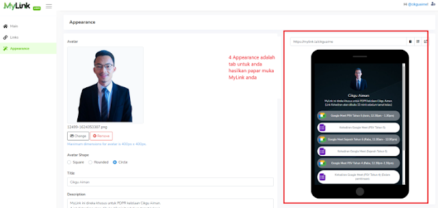 4. Tab Appearance adalah untuk anda hasilkan papar muka MyLink seperti gambar di bawah: