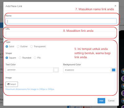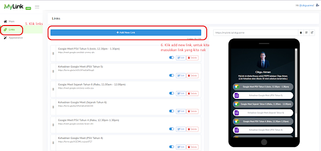 5. Setelah selesai menyiapkan papar muka anda, langkah yang seterusnya adalah proses memasukkan link-link anda ke dalam MyLink. Untuk bahagian ini, klik sahaja pada tab links, kemudian klik +add new link . Kemudian masukkan nama link di bahagian NAME, masukkan link anda di bahagian URL dan anda juga boleh customize kotak yang memaparkan link tersebut.