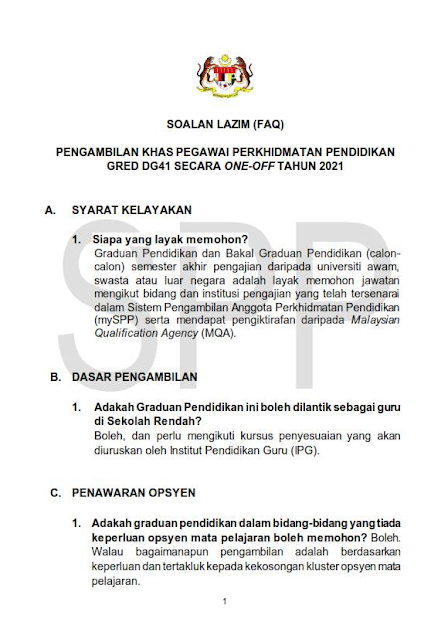 Alhamdulillah permohonan Pengambilan Pegawai Perkhidmatan Pendidikan Gred DG41 bagi tahun 2021 telah pun dibuka melalui laman web SPP pada 7 Julai 2021. Justeru, Suruhanjaya Perkhidmatan Pendidikan (Suruhanjaya) selaku Pihak Berkuasa Melantik (PBM) mempelawa calon-calon yang berkelayakan, berpotensi dan berminat bagi memohon jawatan Pegawai Perkhidmatan Pendidikan (PPP) Gred DG41 untuk lantikan tetap di sekolah-sekolah Kementerian Pendidikan Malaysia. Jadi dalam penulisan kali ini saya akan berkongsi beberapa intipati penting yang terkandung seperti syarat kelayakan, kaedah temuduga dan pengemaskinian dokumen berdasarkan apa yang terkandung dalam laman web mySPP