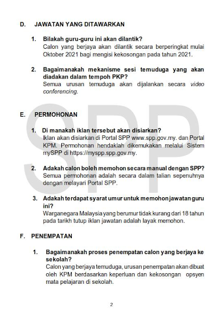 Graduan Pendidikan dan Bakal Graduan Pendidikan (calon-calon) semester akhir pengajian daripada universiti awam, swasta atau luar negara adalah layak memohon jawatan mengikut bidang dan institusi pengajian yang telah tersenarai dalam Sistem Pengambilan Anggota Perkhidmatan Pendidikan (mySPP) serta mendapat pengiktirafan daripada Malaysian Qualification Agency (MQA). Maknanya disini, keutamaan diberi terlebih dahulu kepada graduan ikhtisas pendidikan tertakluk kepada kriteria yang ditetapkan. Namun sekiranya bilangan calon yang berjaya dari kalangan graduan pendidikan tidak mencukupi maka permohonan dari kalangan calon-calon yang tidak memiliki ikhtisas pendidikan akan dibuka. Jadi disini, usaha dulu, Insya-Allah pasti ada rezeki.