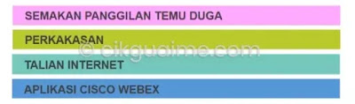 Aplikasi Cisco Webex. Aplikasi ini adalah percuma dan disarankan untuk download aplikasi ini. Walaupun tersedia melalui dua platform iaitu web based dan aplikasi, disarankan untuk menggunakan platform aplikasi kerana taliannya lebih kuat berbanding web based.