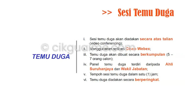 Perkakasan. Disarankan menggunakan laptop ataupun komputer berbanding telefon kerana tempoh temu duga adalah 1 jam, satu tempoh yang agak lama dan boleh menyebabkan telefon ataupun tablet panas. Pastikan juga bateri mencukupi supaya tidak berlaku masalah tiba-tiba shutdown semasa temu duga.