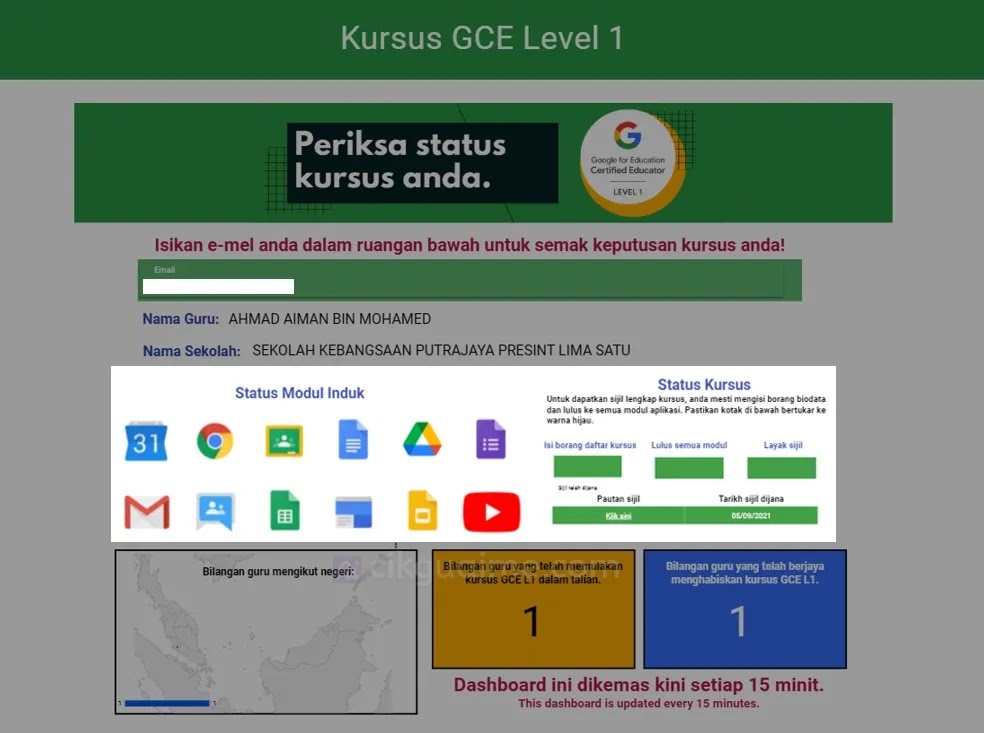 - Anda akan menerima sijil apabila kesemua ikon Google Tools menyala/berwarna dan kotak merah bertukar kepada hijau.
